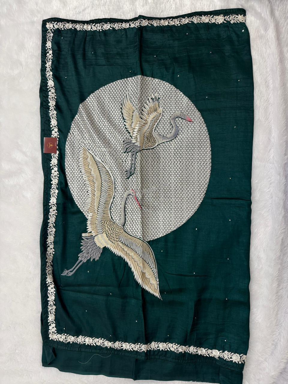 This exquisite raw silk saree features a captivating flamingo motif on the pallu, blending traditional craftsmanship with a contemporary aesthetic. The natural slub texture of the raw silk provides a rich, matte finish that highlights the intricate bird design.